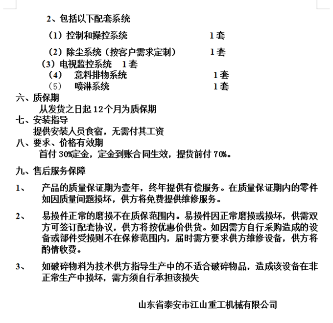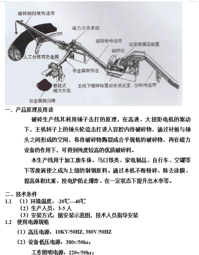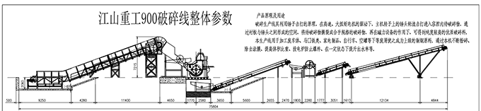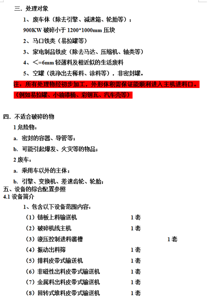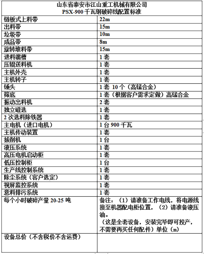 山东省泰安市江山重工机械有限公司 PSX-900 千瓦钢破碎线配置标准 链板式上料带 22 m 出料带 15 m 垃圾带 10 m 成品带 8 m 旋转堆料带 15 m 进料溜槽 1 套 压辊送料机 1 套 主机外壳 1 套 主机...